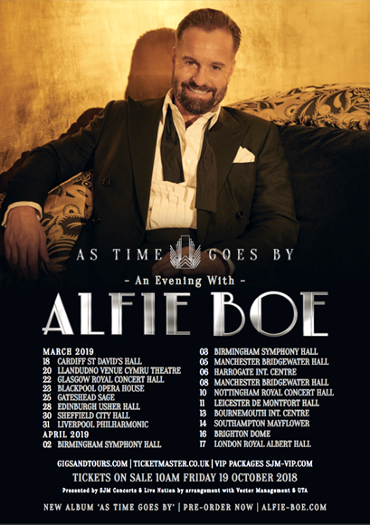 Tickets go on general sale 10am on Friday 19th October. Pre-sale tickets will go on sale at 10am on Wednesday 17th October and can be accessed by pre-ordering Alfie’s new album ‘As Time Goes By’ from www.HMV.com by 11.59pm on Monday 15th October.