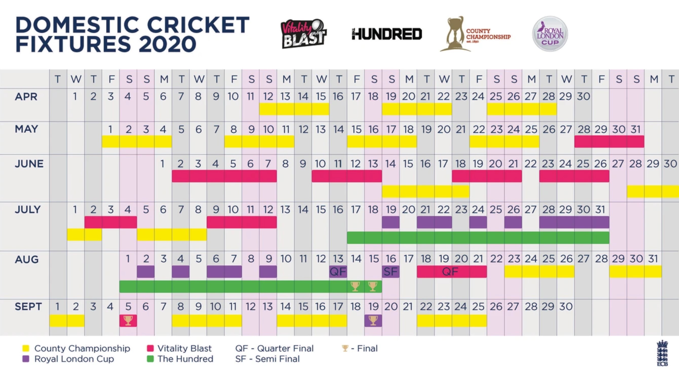 Fixtures for the County Championship, Royal London Cup, The Hundred and Vitality Blast have been announced